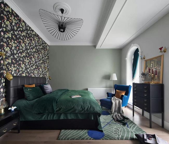 來自雨林的壁紙,黑色是土壤,綠色是生命,剩下來的都是生活;坐在床頭,透過拱門與絨簾,可以感受來自浴室的春風沐雨。