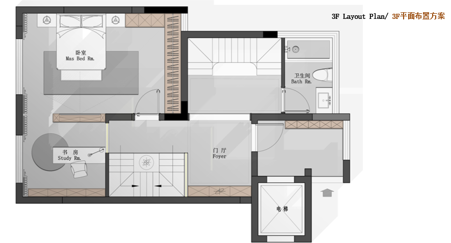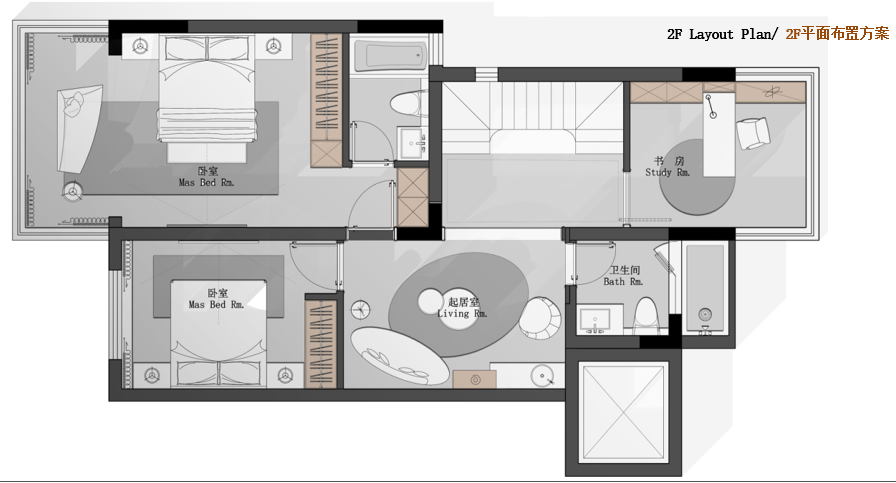 2F: 臥室套房,臥室,起居室,衛(wèi)生間,書房【88.5㎡】