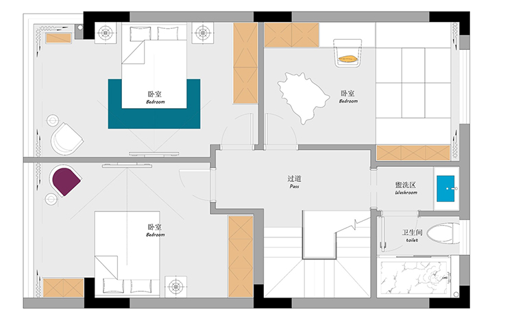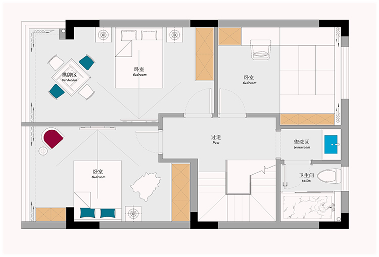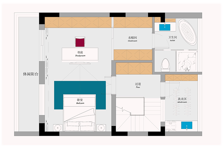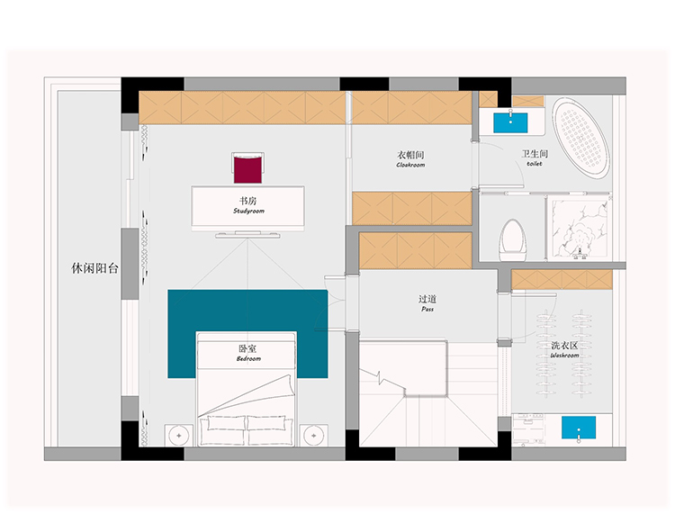 熙華府二層通過(guò)敲砌墻重新規(guī)劃,熙華府主臥設(shè)計(jì)成了一個(gè)大套房。按照客戶對(duì)臥室數(shù)量的需求,南面房間既可以作為書房來(lái)布置,也可以布置成次臥來(lái)使用,可以滿足業(yè)主4房的需求。如果作為書房使用,則北面房間與衛(wèi)生間打通,做一個(gè)有內(nèi)衛(wèi)的小套房。如果南面房間作為臥室使用,則保留原有公衛(wèi),北面房間作為一個(gè)兒童房來(lái)使用。