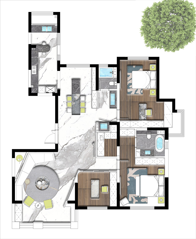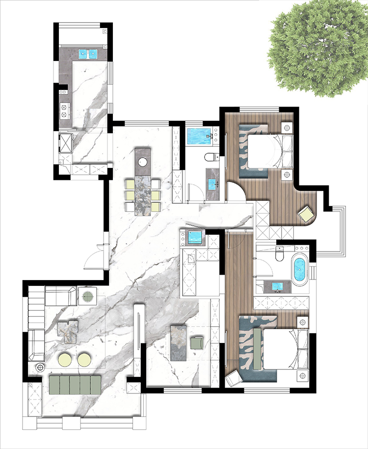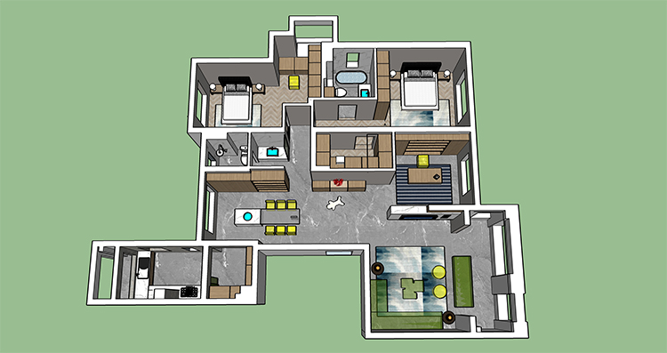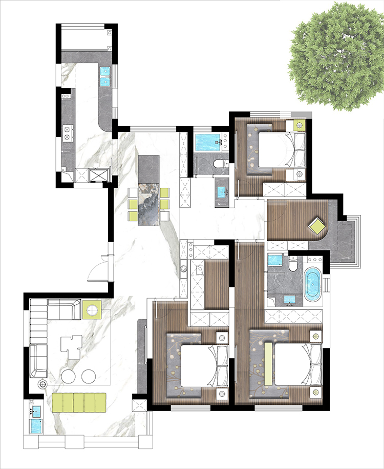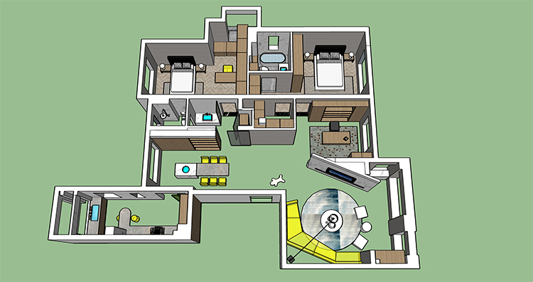 方案二也是設(shè)計師主推的一套方案,進門一個玄關(guān),整體空間往南面移了一點,由于承重結(jié)構(gòu)進入客廳的過道永遠打不開,是大平層的空間感提現(xiàn)不出來,所以我們設(shè)計師如圖拉了一個平行的造型,追大程度打開這塊空間,然后其他兩塊區(qū)域也劃分明了,大人小孩互不干擾,書房也設(shè)置在南面,整體視野非常開闊,可以看到蠡湖風(fēng)景。客戶也很此套方案。方案三也比較常規(guī)