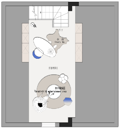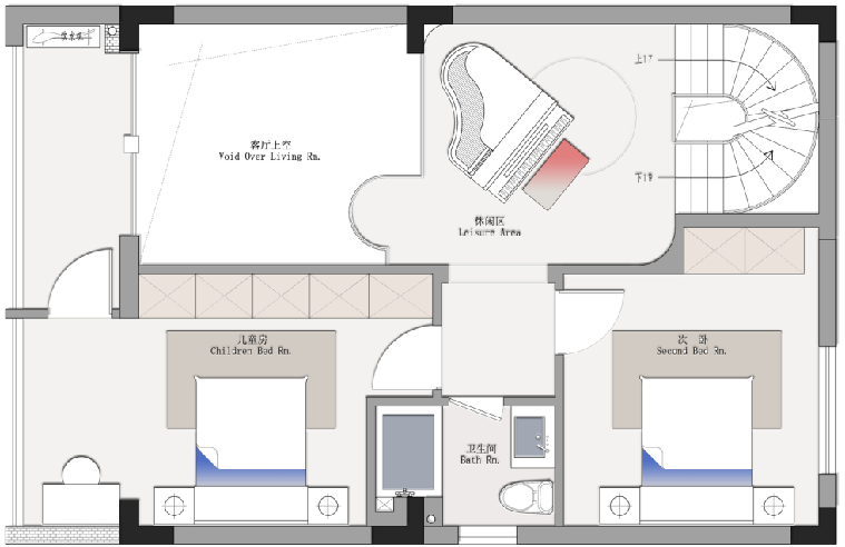 二樓設(shè)置了兩個(gè)房間,其中一個(gè)兒童房,在樓梯口上來的公共區(qū)域放置了小孩的三角鋼琴,上樓儀式感十足,旁邊一個(gè)挑空區(qū)域很浪漫優(yōu)雅,專為女主人打造。