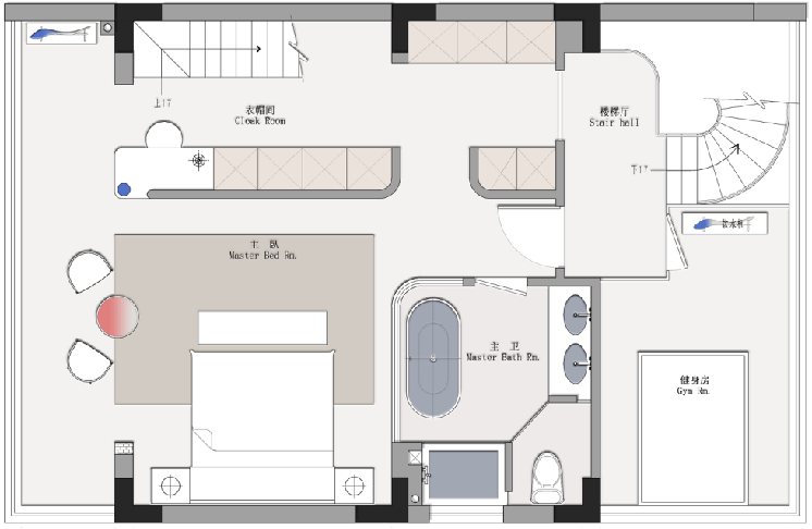 三樓整體做的一個(gè)主臥大套房,外面公共區(qū)是一個(gè)男主人的健身區(qū)域,后面的樓梯上去閣樓設(shè)置了一個(gè)親子娛樂區(qū),整體品質(zhì)非常高!