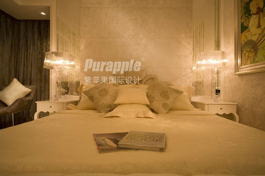 2、輕柔浪漫色調(diào):中心色為柔和的粉紅色。地毯、燈罩、窗簾用紅加白色調(diào),家具白色,房間局部點綴淡藍,有浪漫溫柔的氣氛。