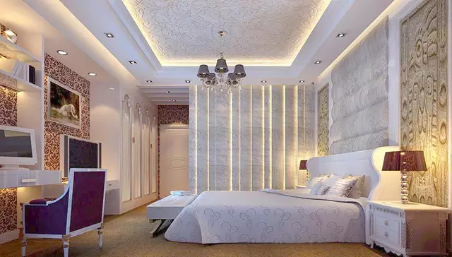 臥室的功能主要是睡眠休息,屬私人空間,不向客人開放,所以臥室裝修不必有過多的造型,通常也不需吊頂,墻壁的處理越簡潔越好,通常刷乳膠漆即可,床頭上的墻壁可適當(dāng)做點(diǎn)造型和點(diǎn)綴。臥室的壁飾不宜過多,還應(yīng)與墻壁材料和家具搭配得當(dāng)。無錫別墅裝修中臥室的風(fēng)格與情調(diào)主要不是由墻、地、頂?shù)扔惭b修來決定的,而是由窗簾、床罩、衣櫥等軟裝飾決定的,它們面積很大,它們的圖案、色彩往往主宰了臥室的格調(diào),成為臥室的主旋律。