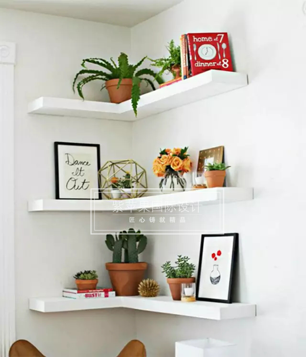 像上圖這樣安裝幾層轉(zhuǎn)交式的置物架是個不錯的主意。簡單放上鮮花綠植、畫作和小裝飾就已經(jīng)很漂亮,當(dāng)然,你還可以用來放書,或者漂亮的餐具。不過在放的時候一定要考慮到置物架的承重能力,以免發(fā)生意外。