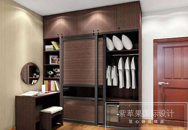 解決方法:布置衣柜區(qū)域有柱子,可以在此處做成淺柜的形式,解決掉柱子的問題。淺柜與梳妝臺的拼搭,讓梳妝臺與衣柜整體統(tǒng)一,更具連貫性。