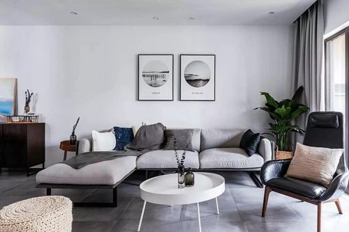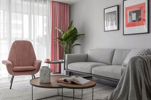 窗簾的粉紅既不花哨又不會單調(diào)無趣,且與灰色沙發(fā)、木紋茶幾融成一個十分和諧的視覺整體。