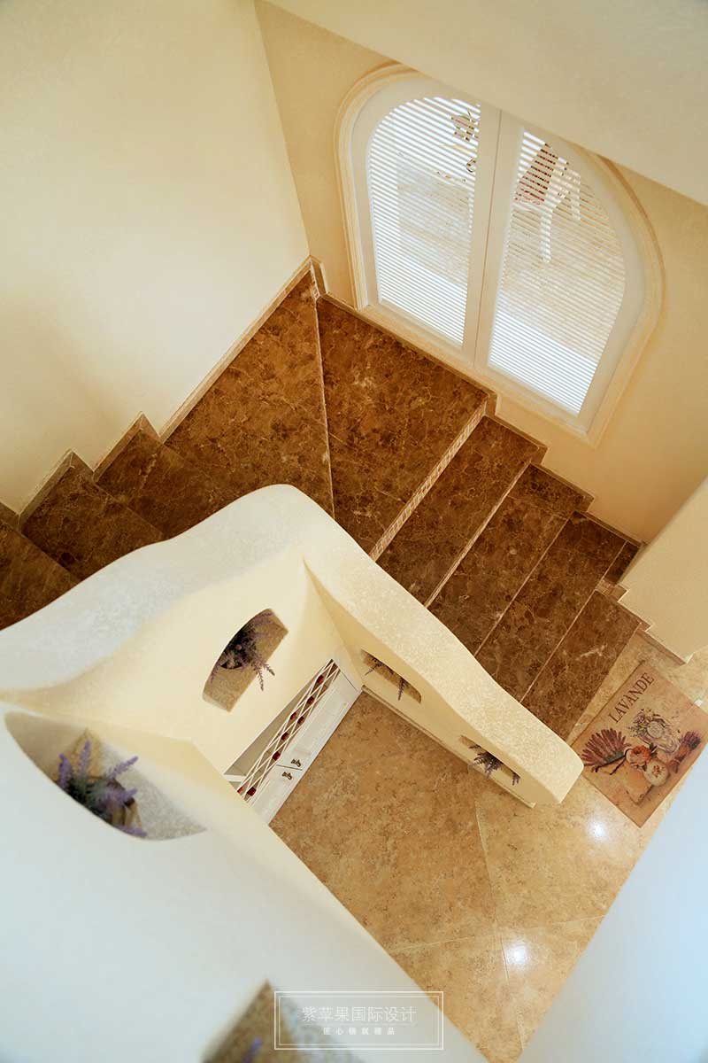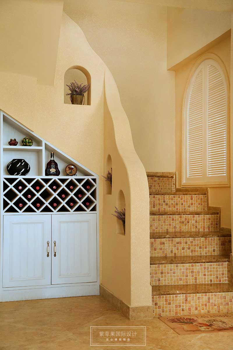 樓梯這邊扶手,給人的感覺更為自然,散發(fā)著地中海的那種休閑氣息。巧用空間設(shè)置了一個(gè)簡易的酒柜。