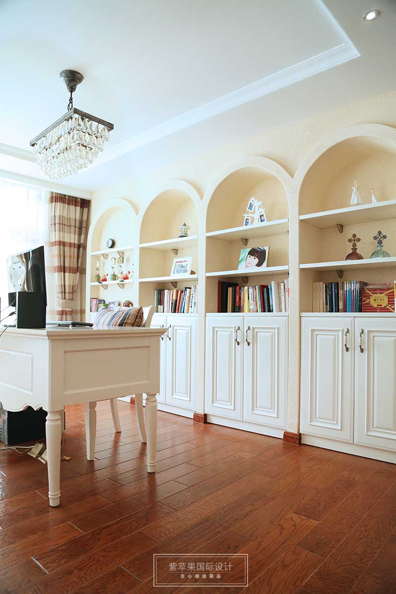 白色的書房依舊延續(xù)整體風(fēng)格的簡單與安寧?;⌒螘袢峄臻g的線條,大面積儲(chǔ)物空間,既有充足的空間擺放書籍,也可以方便業(yè)主為來客展示自己家人的回憶和自己心愛的藏品!