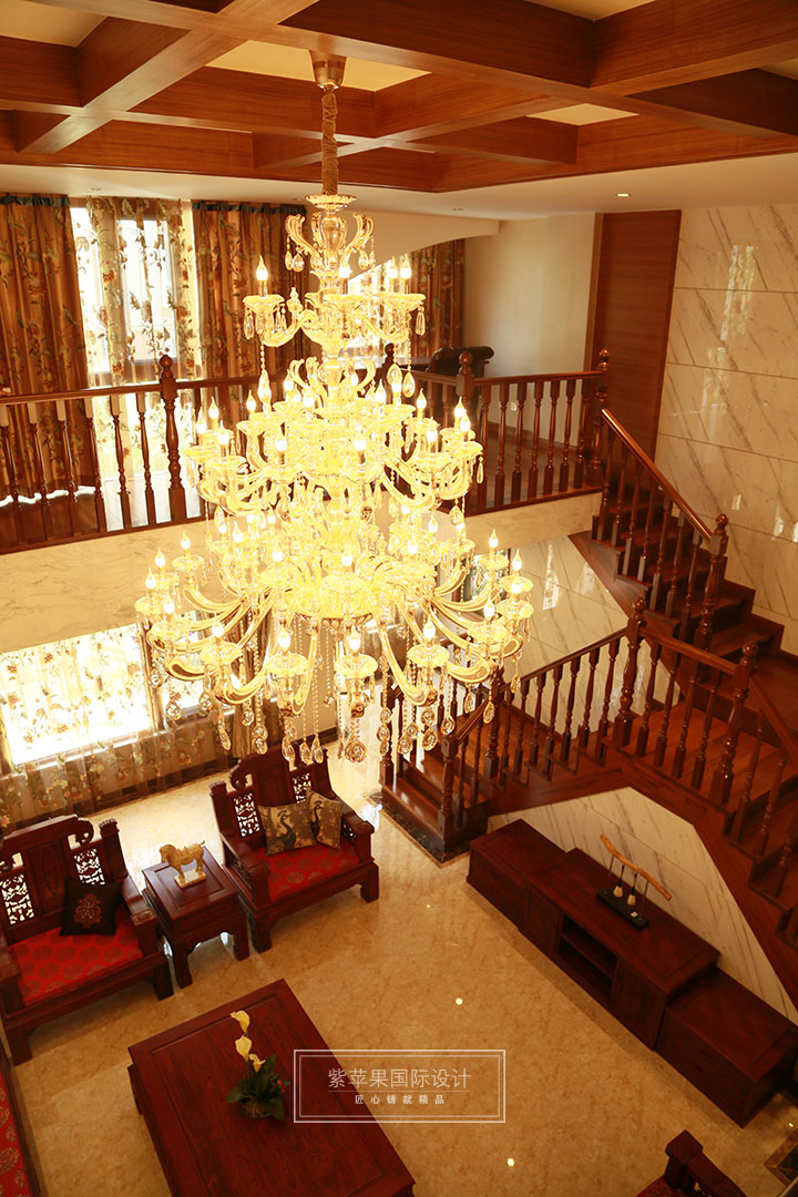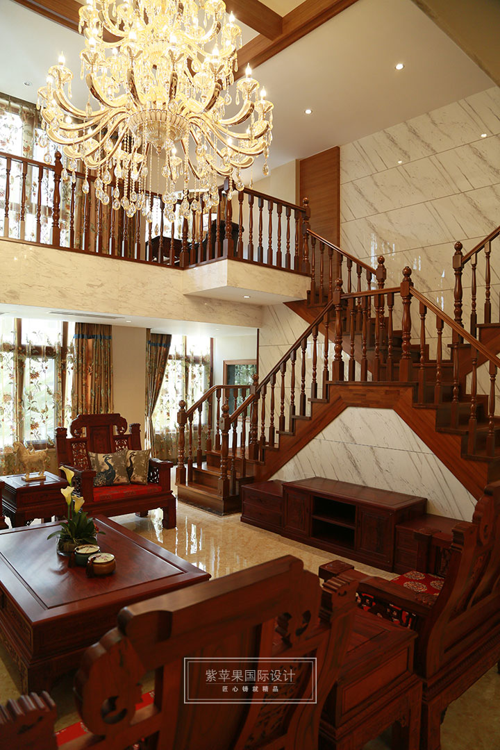 客廳空間高大開闊,色彩濃重而成熟,中式的元素在空間里的運用巧妙??傮w布局對稱均衡,端正穩(wěn)健,而在裝飾細節(jié)上,崇尚自然情趣,如抱枕圖案,窗簾花紋等飾以花鳥,蟲魚等精雕細琢,富于變化,充分體現(xiàn)出中國傳統(tǒng)美學精神。