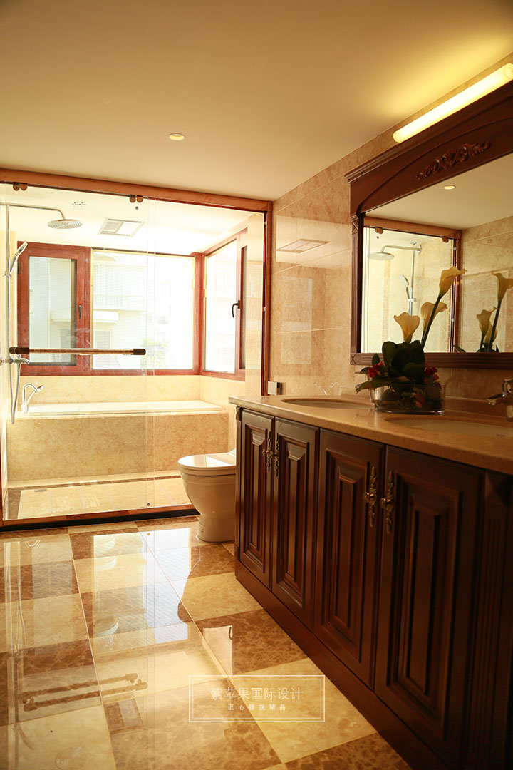 衛(wèi)浴室空間通透,采光好,造型上簡約,不失精致。古典與現(xiàn)代的結(jié)合,設(shè)計師以簡潔的表現(xiàn)形式來滿足人們對空間環(huán)境那種感性的、本能的和理性的需求。