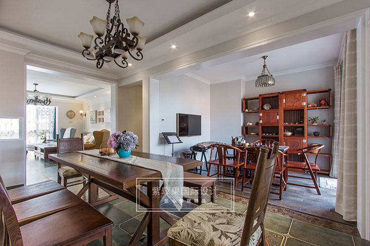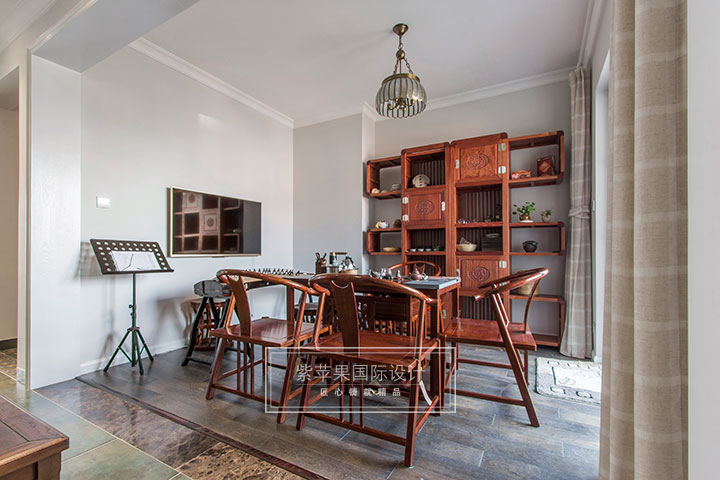 本案業(yè)主一家都很喜歡喝茶,所以廚房邊上的空間經(jīng)過改造與廚房連接成了一個古色古香的茶室兼琴室空間。在一個有著春日暖陽的午后,主人一家人在這里一邊聽著古箏,一邊悠閑地品茗,愜意的生活從點滴便可體現(xiàn)?;蚴侵魅艘粫r興起,為家人彈奏古箏,餐廳空間也會成為觀眾們安靜欣賞的區(qū)域,為家庭生活帶來更多情調(diào)。