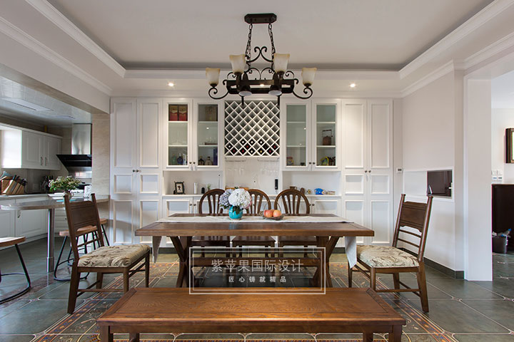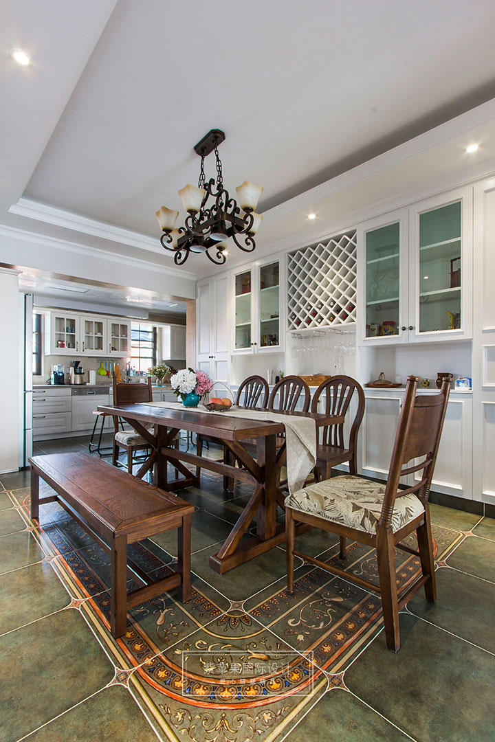延續(xù)客廳墨綠色復古地磚,餐廳擁有同樣精美的景致。一整面酒柜的設(shè)計讓主人心愛的紅酒有了好歸宿,這樣的設(shè)計不但美觀,還增強了餐廳的儲藏功能,使得生活更加井井有條。