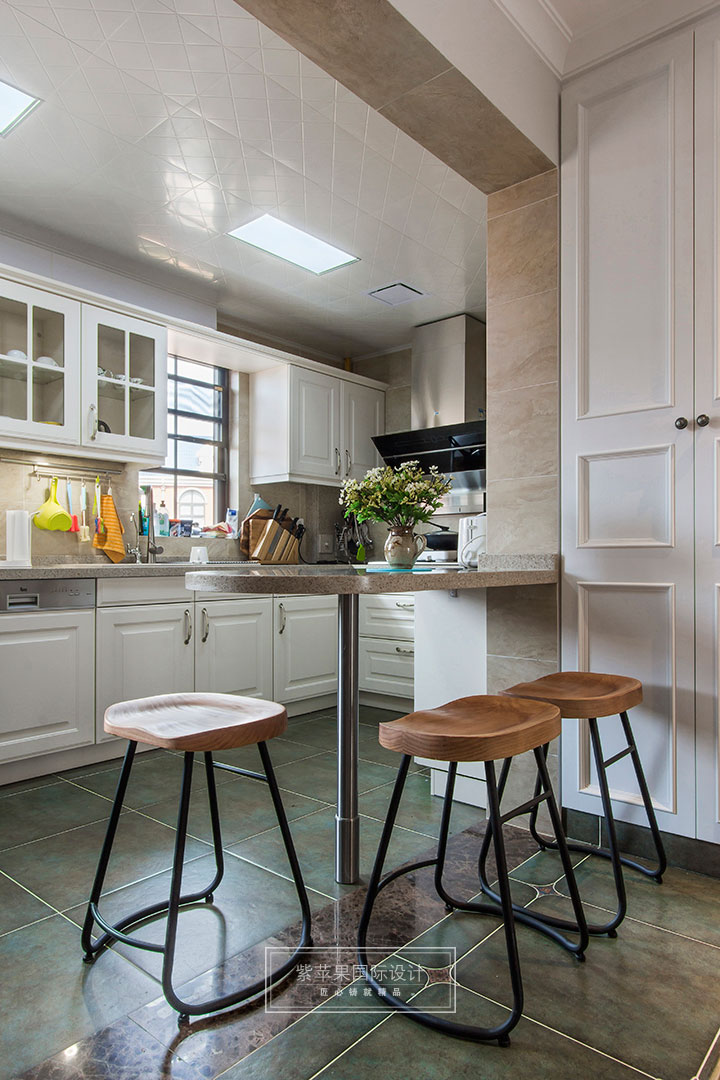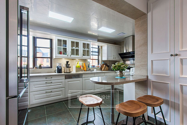 廚房是體現(xiàn)居家品質(zhì)的重要空間。在本案中,廚房本連接一個生活陽臺,但是應業(yè)主對廚房空間“寬敞”的需求,設(shè)計師將生活陽臺進行拆除,納入廚房空間,同時,設(shè)計師對廚房采用開放式廚房設(shè)計,并在廚房和餐廳間做了一個小吧臺的設(shè)計,讓餐廳廚房聯(lián)通,使得整體空間通透關(guān)聯(lián),讓餐廳也有自然光線注入,更顯寬敞明亮。