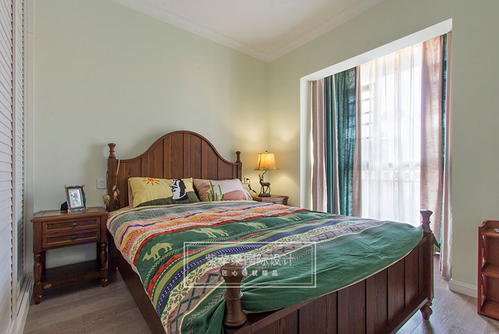 女兒房區(qū)別主人房藍色色調(diào),采用稍顯活潑的綠色,同樣也利用一面墻的空間做了衣柜,便于收納。