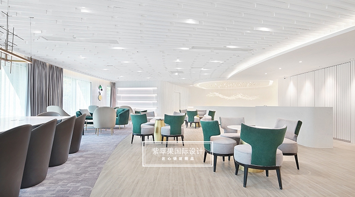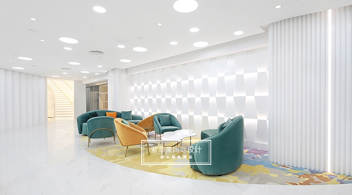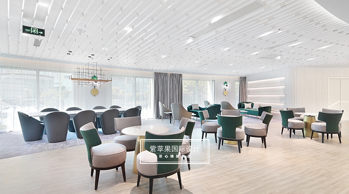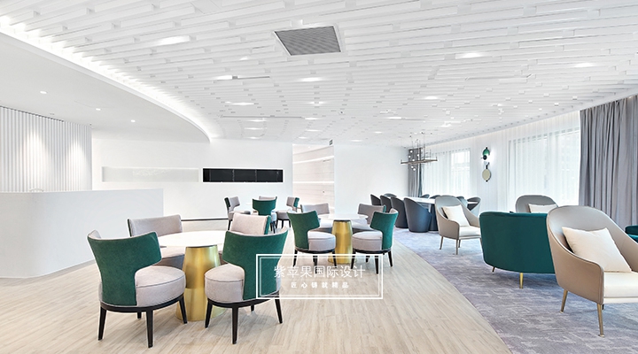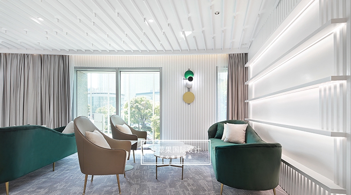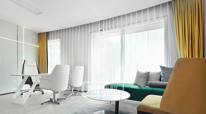 大堂設計貼合現(xiàn)代極簡理念,充分利用空間安置多功能區(qū),大面積留白的區(qū)域搭配由明黃、湖綠和金屬色組成的軟裝,軟硬裝格調統(tǒng)一凸顯質感。二樓地面多采用地板、地毯等材質,有效降低女士腳踩高跟鞋發(fā)出的噪聲干擾,也會提高她們在走路時感受到的舒適感。洽談區(qū)的落地玻璃窗廣納自然光線,將朝暮風光、四時景致全盤納入其中,為空間點染別樣雅致的氣息。