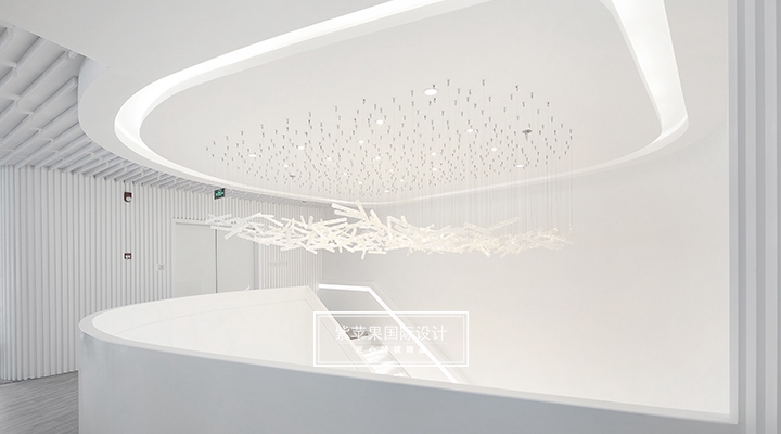 前臺頂面由大小不一的頻率點燈鋪滿,空調出風口配合整體美觀性也為小圓形狀,既體現(xiàn)了設計師對美感細節(jié)的追求,同時又減少了吊燈使用的單調性也能改善層高對人的壓迫感。墻面燈帶設計融合于整體空間,提升明亮度且有一定的柔和感,無不彰顯溫柔細膩的感覺。