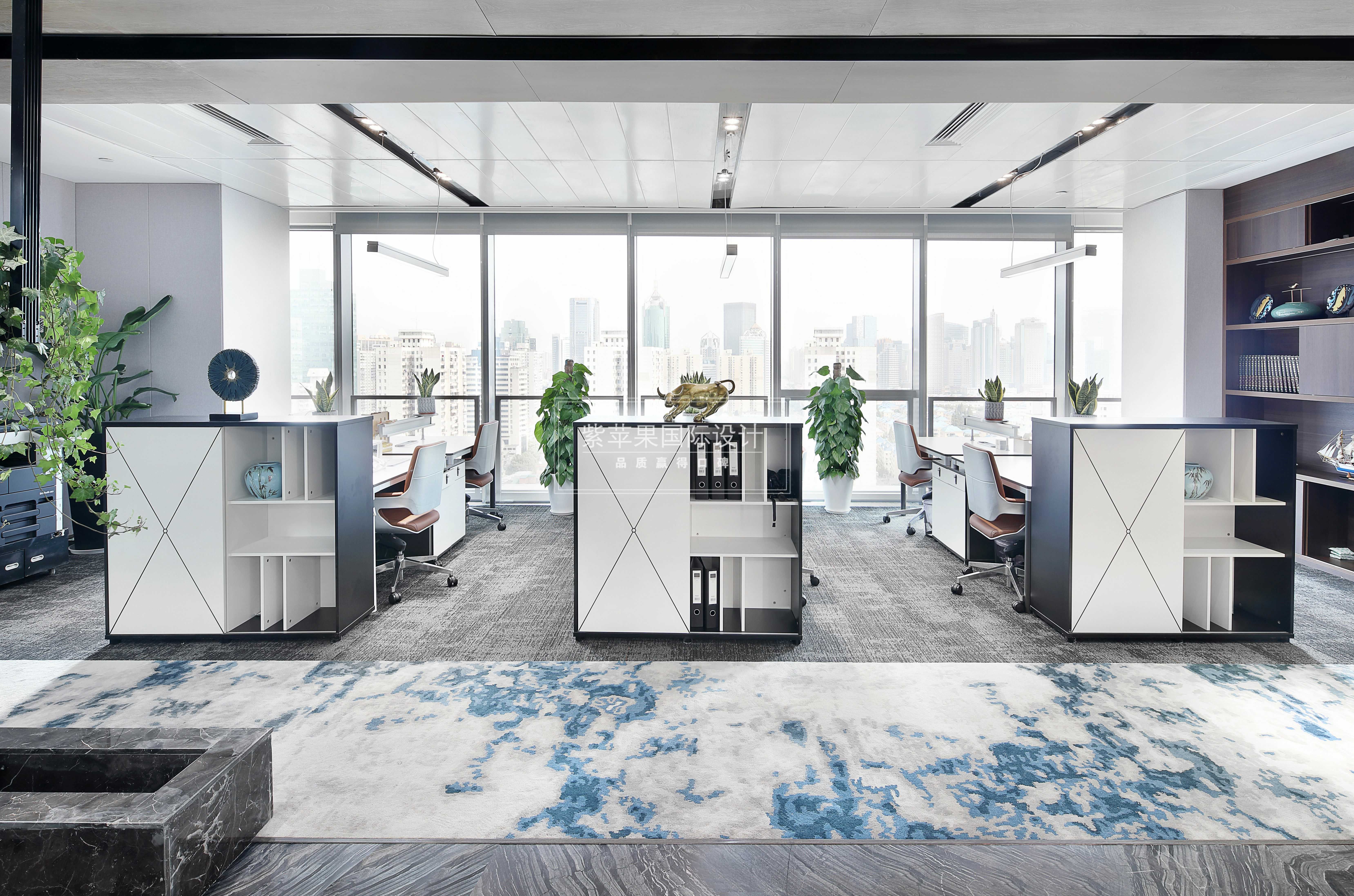 藍(lán)色潑墨圖案的地毯為通向其他場所巧妙的設(shè)置出了一條引導(dǎo)路線,也將辦公區(qū)域和前臺接待區(qū)很好地隔離開來,劃分功能區(qū)的同時也保證了美觀性。