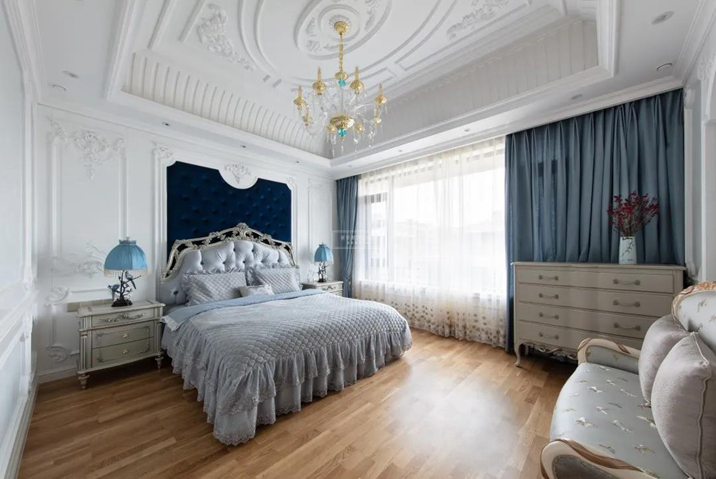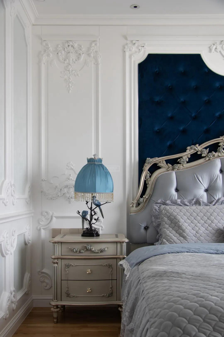 天花板、墻壁石膏雕花線條配合著絨布軟包的背景墻,獨(dú)占這一室的雅致輕盈。