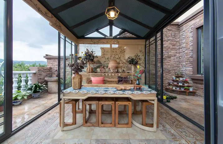 大露臺為南向,解決南向陽光房的隔熱是陽光房設計的難點,在此陽光房的設計為中空鋼化+內(nèi)置鋁百葉頂面處理,及四向通風處理,配合繪畫竹簾來完成。