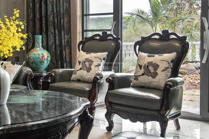 大量木飾面和石材的裝飾,新古典元素的灰調(diào)皮質沙發(fā),模仿動物形狀的家具腳腿造型,用現(xiàn)代人生活的審美做設計,讓美式風格的歷史感,也充滿了現(xiàn)代生活的精致與個性。
