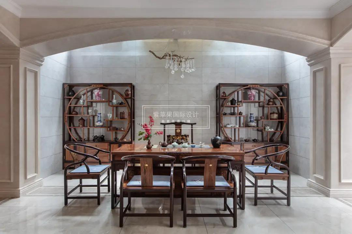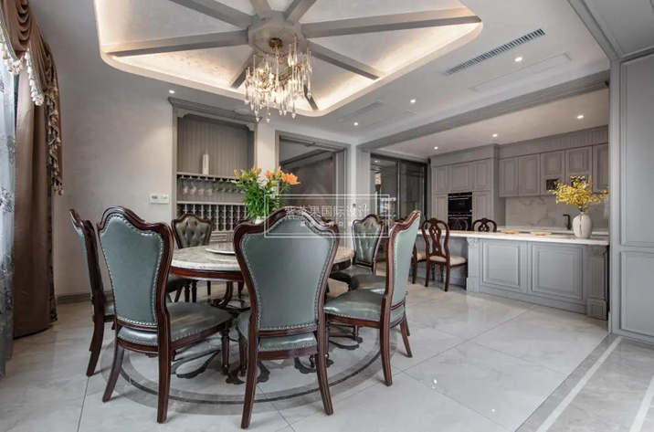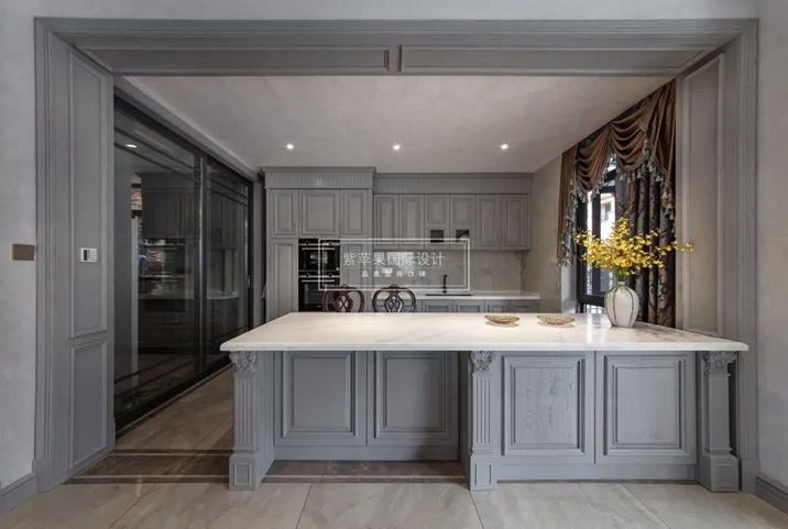 中餐重煙重油,單獨封閉設計,外面裝上玻璃門,隔絕油煙;西廚開放式設計,二字型布局,島臺裝在西廚與餐廳之間用作隔斷,營造出更具情調(diào)的生活氛圍。