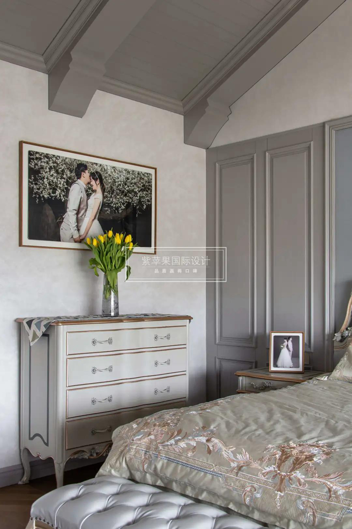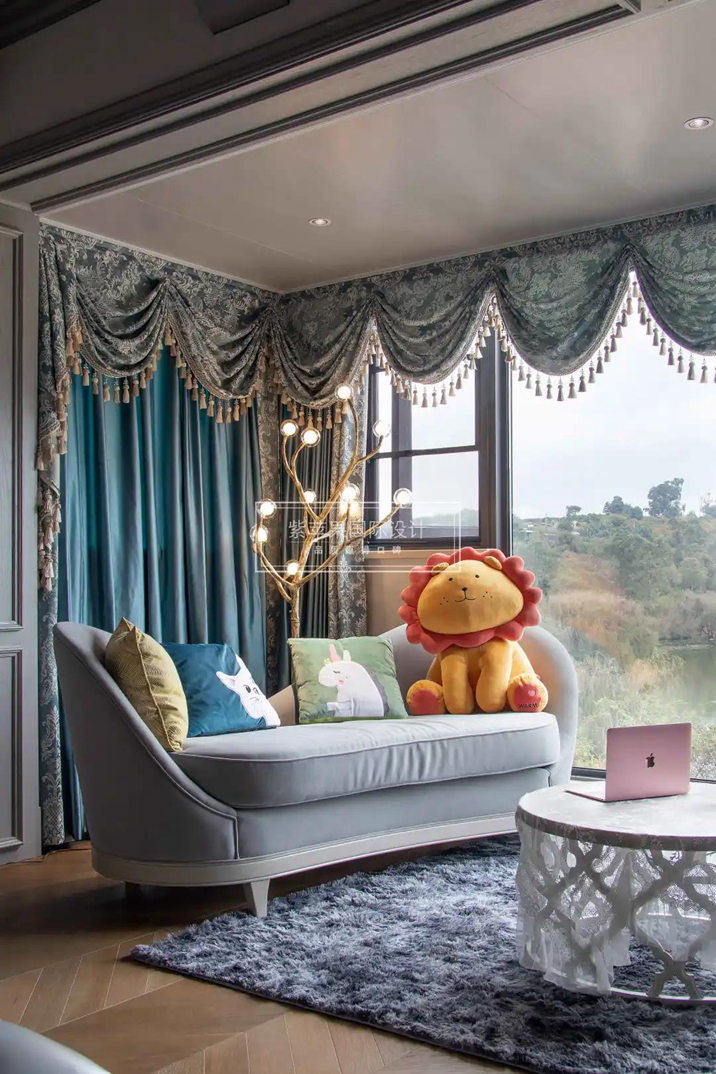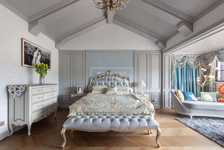 推開臥室的門,我想到了《致愛麗絲》這首鋼琴曲,仿佛看到了女主人溫柔、優(yōu)雅的形象?!拜p裝修,重裝飾”,不做復雜的硬裝設計,清新美式,淺淡的灰色,融入藍色的硬包背景墻色調(diào),搭配立體雕花、銅色鑲邊的歐式家具,細膩且精致。