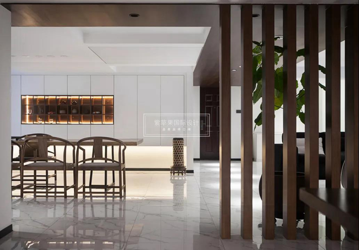 木格柵的纖細筆直,讓空間看起來更加高挑,環(huán)形幾何線條吸頂燈,木材的溫潤素雅,在寬闊的空間之中增加了視覺的層次感。