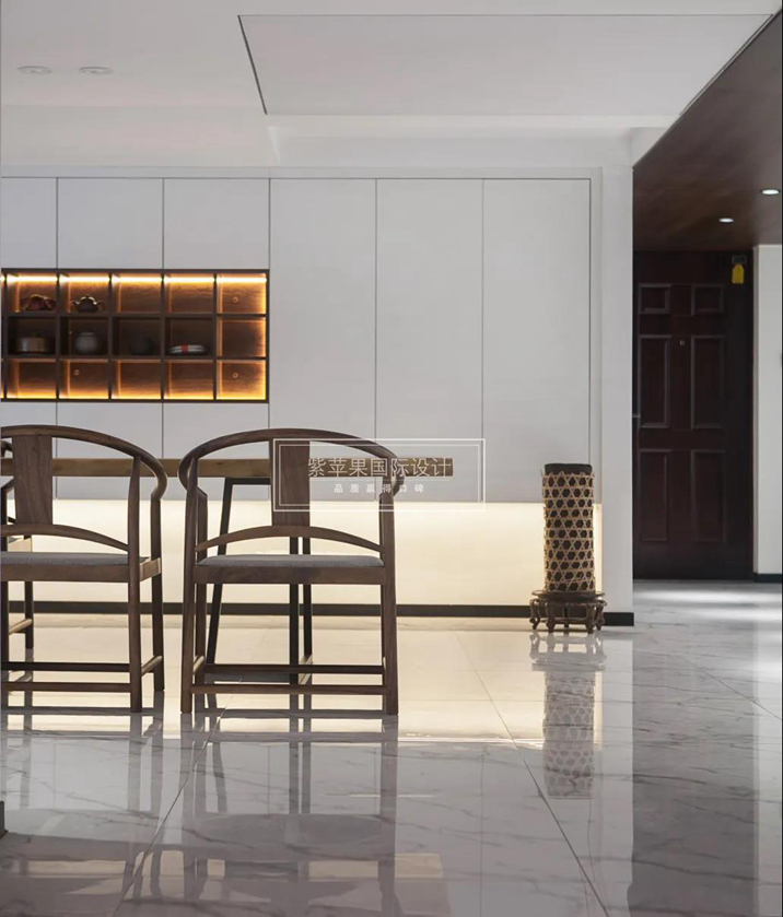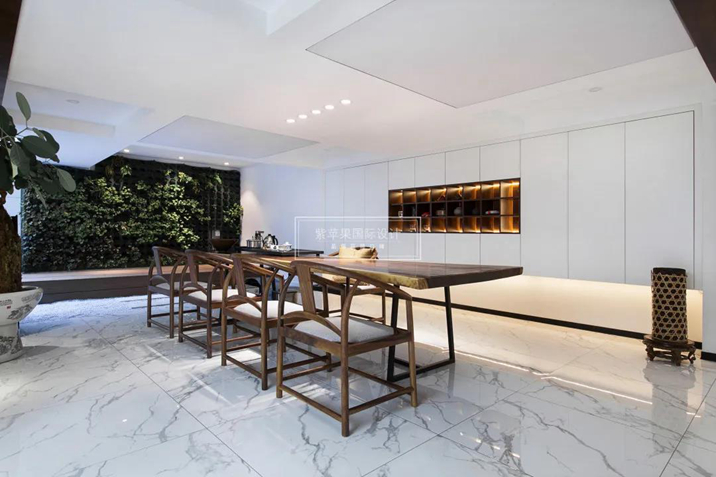細節(jié)是影響空間美學的設(shè)計因素,綠植墻的生機、木制的清氣、背景墻收納柜的留白、色彩的低飽和度、燈光的溫潤……各類軟飾元素在空間中的形成,空靈中有雅。