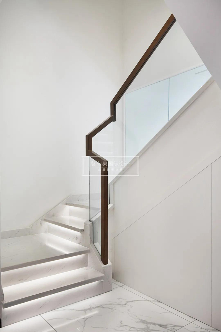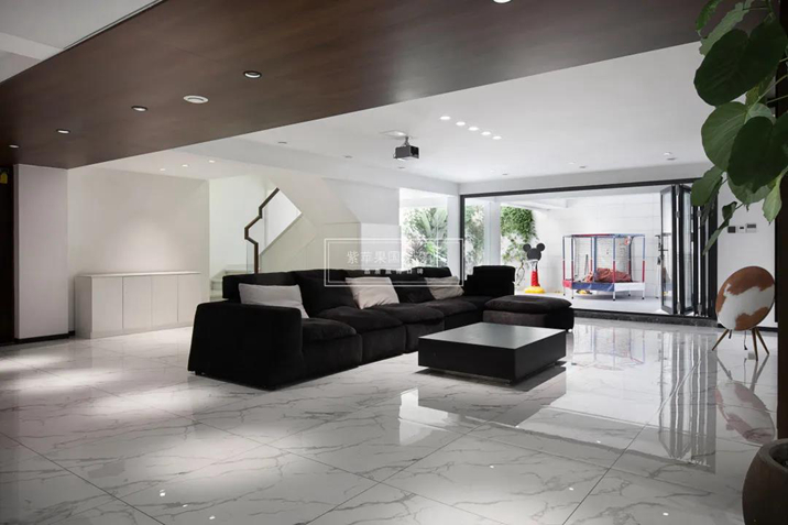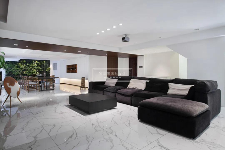 負一層作為娛樂休閑功能區(qū),設(shè)計師以完全敞開的空間布局手法,最大限度的橫向打開空間。在不同空間產(chǎn)生豐富的視線以及情感交流,沒有繁復設(shè)計的影音室,簡單茶幾,柔軟短絨沙發(fā)的布置,詮釋生活的個性與溫度。