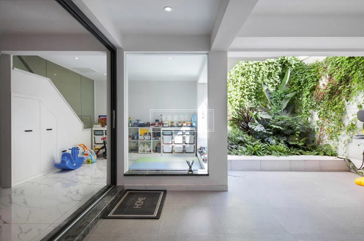 餐桌一旁的玻璃門,將戶外的景觀引入室內(nèi),將用餐時的視野變得更加開闊,屋外的自然景觀成為了用餐時的畫中美景。